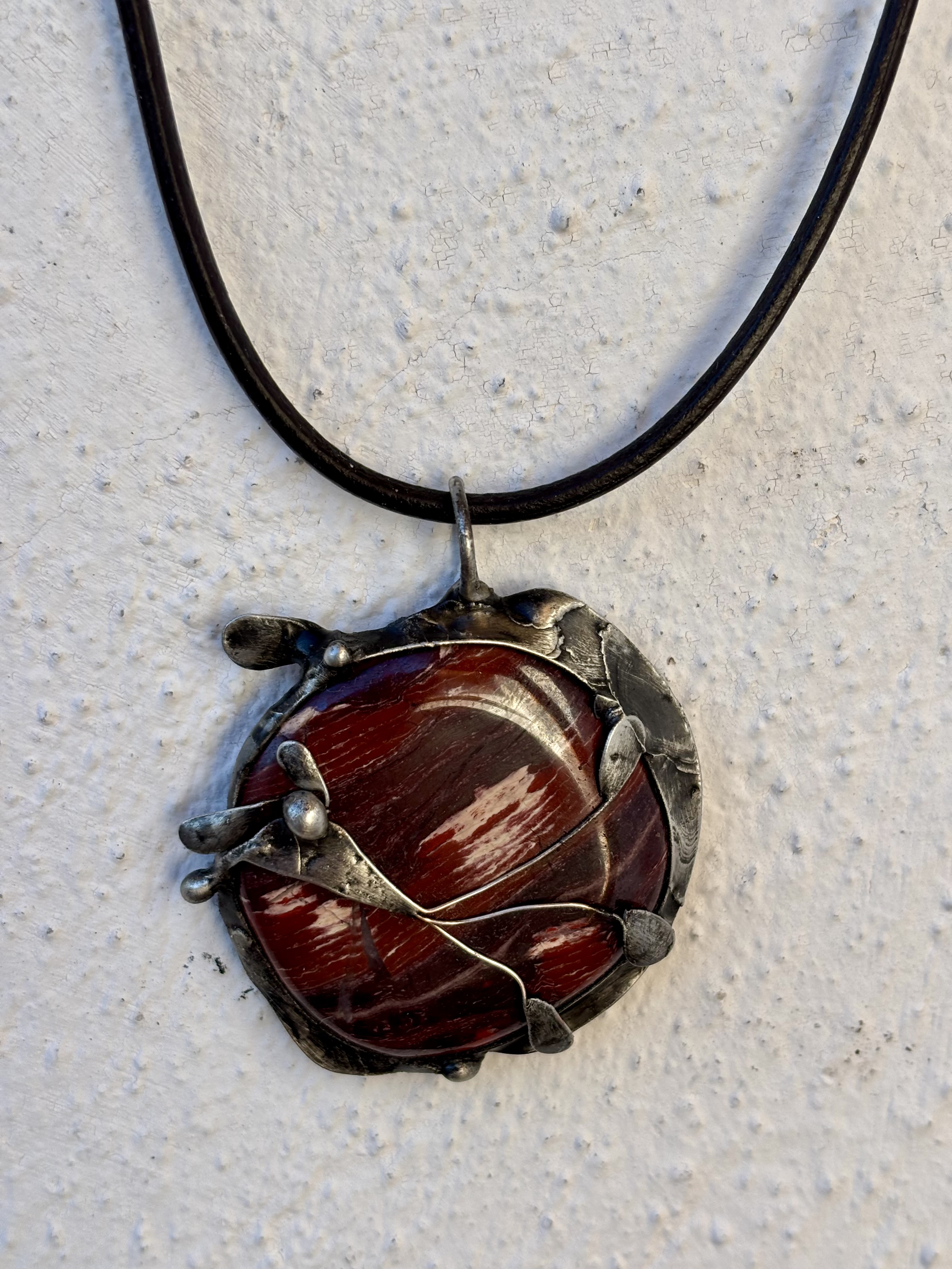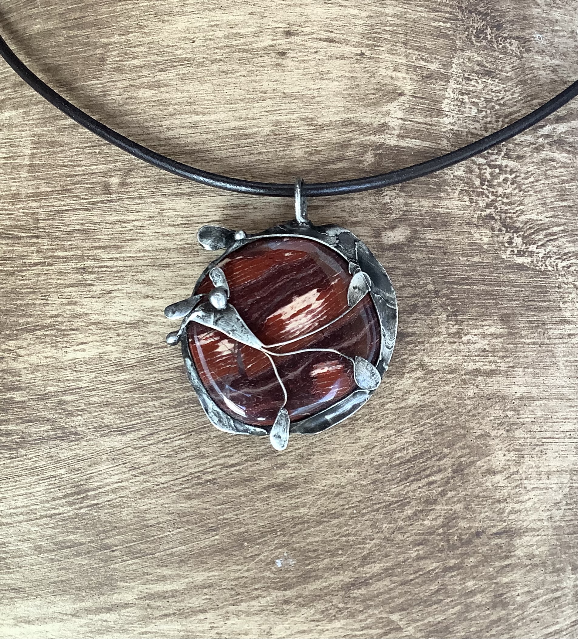 Bezolovnatým cínem s příměsí stříbra pájený autorský šperk, doplněný jaspisem červeným.