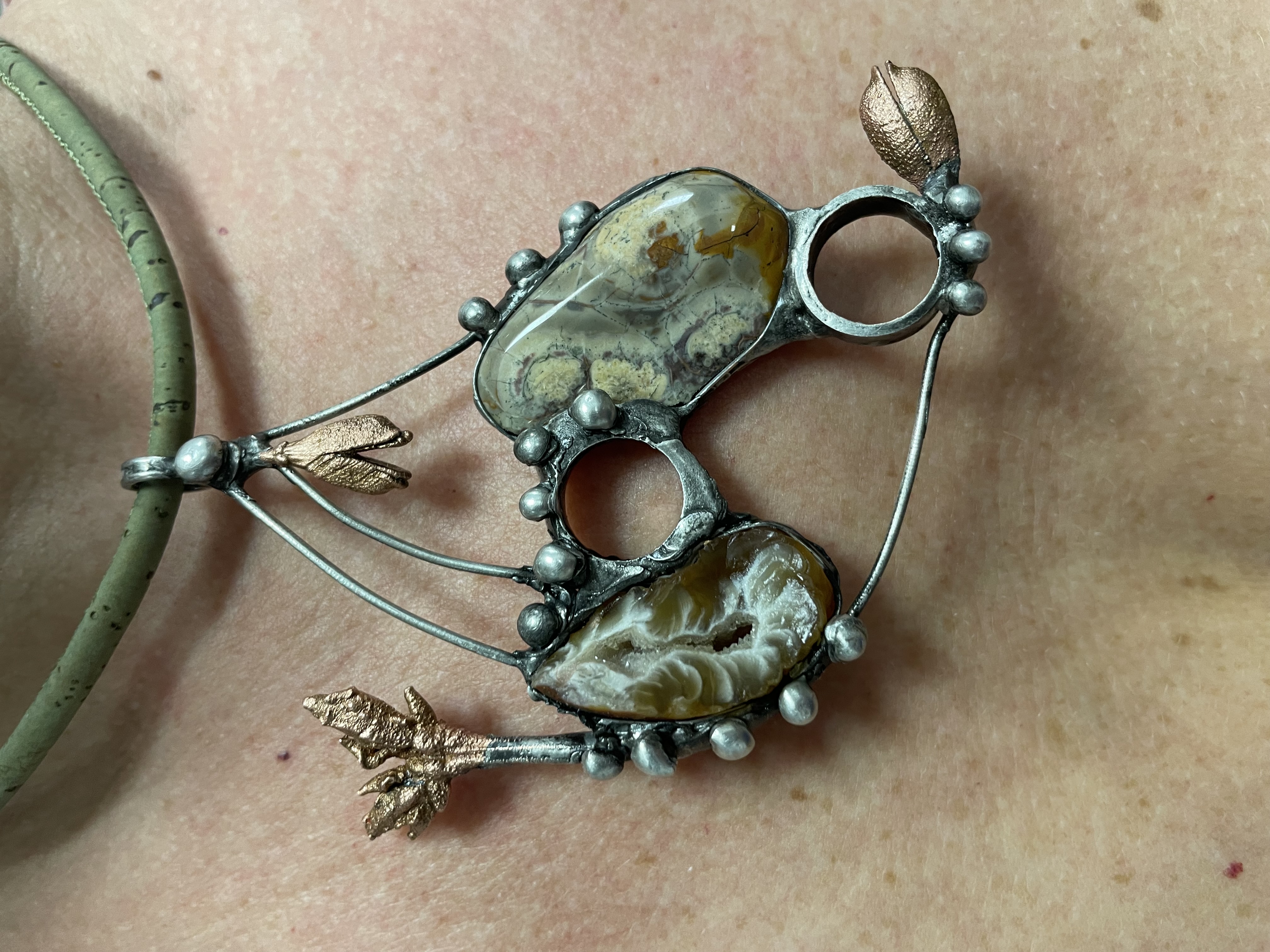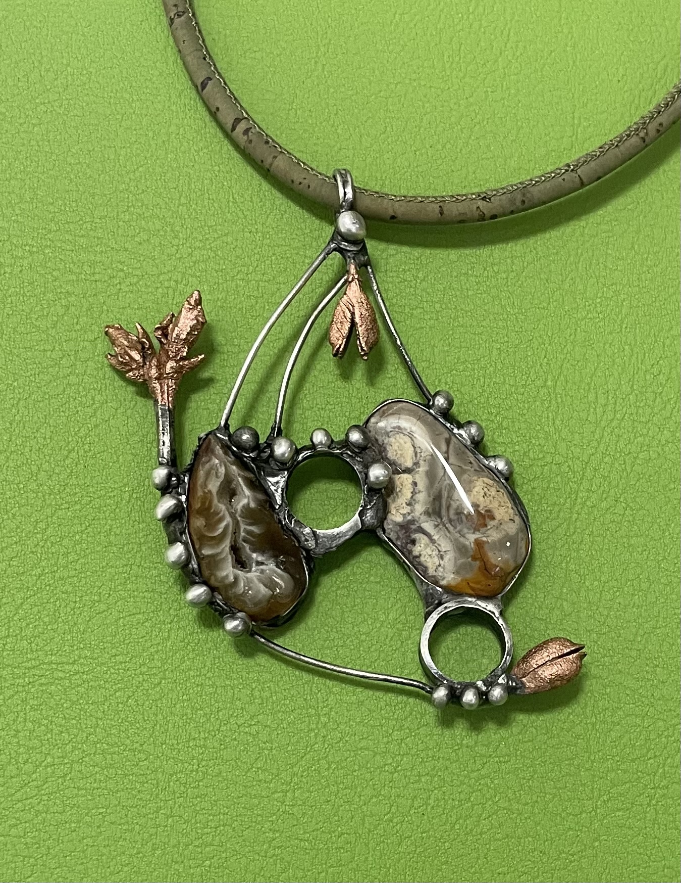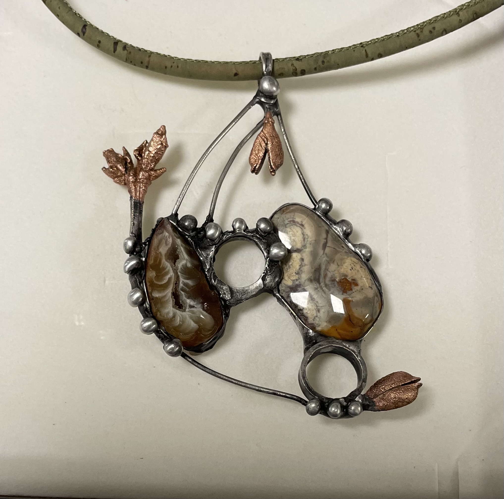 Bezolovnatým cínem s příměsí stříbra pájený autorský šperk doplněný peříčkovým achátem, ryolitem a galvanovanými pupeny.