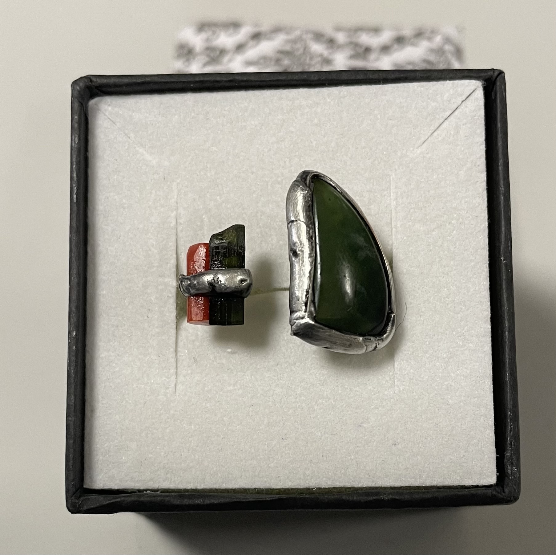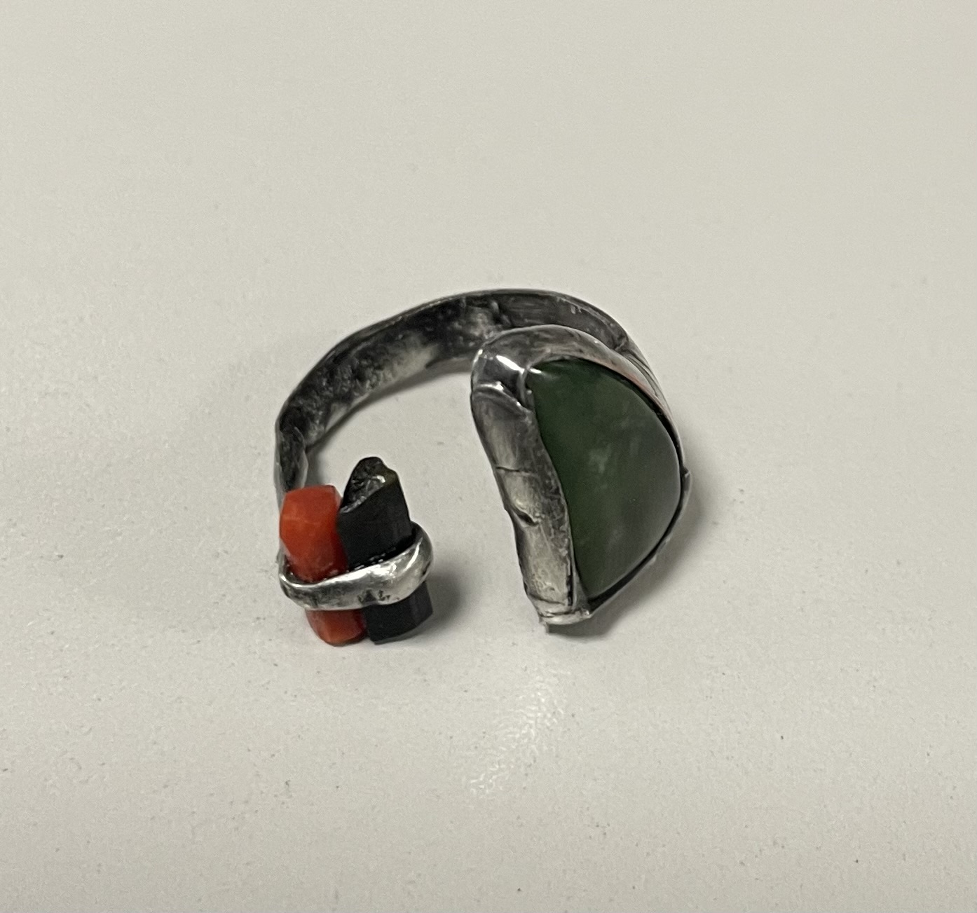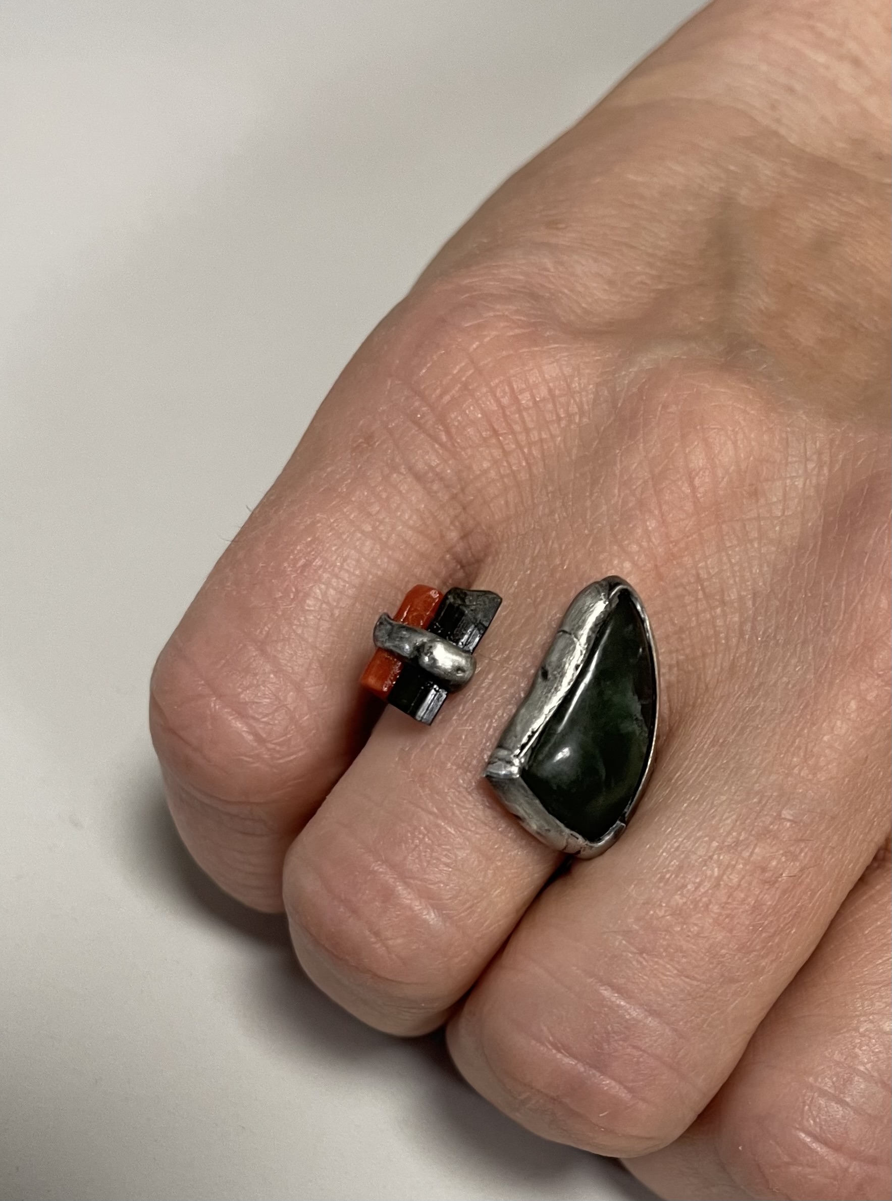Bezolovnatým cínem s příměsí stříbra pájený autorský prsten  doplněný serpentinem, turmalínem verde a korálem.