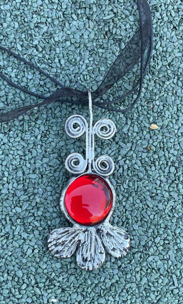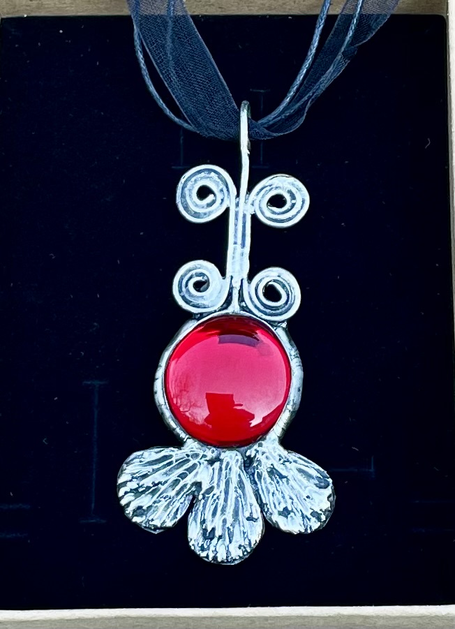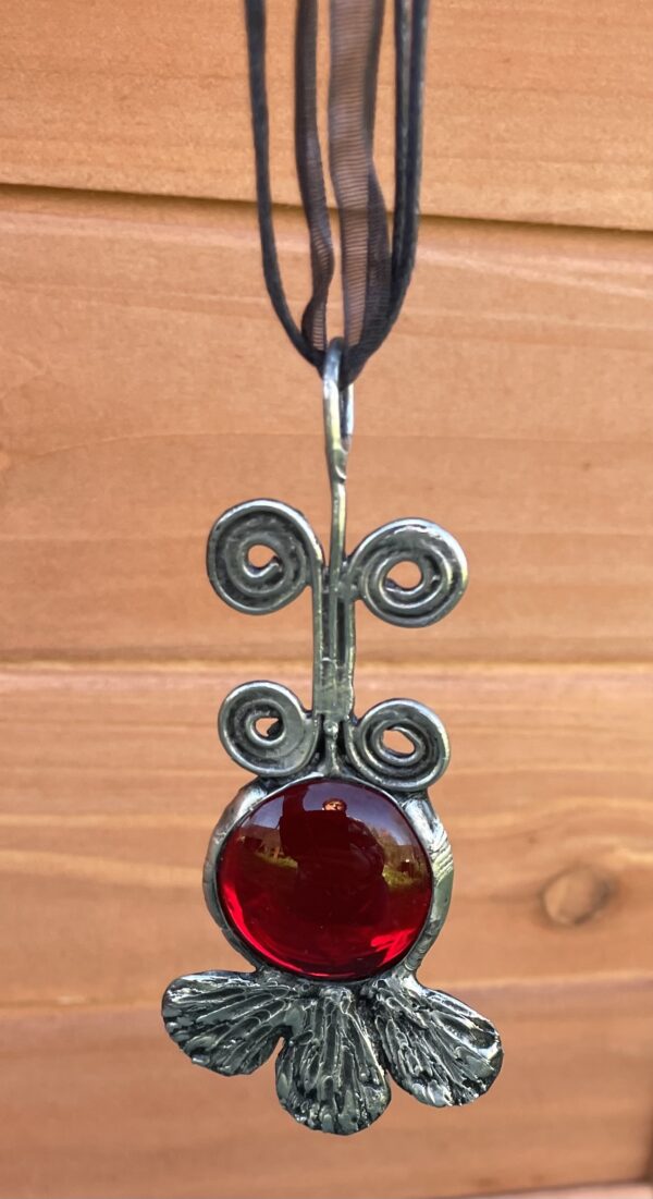 Bezolovnatým cínem s příměsí stříbra pájený autorský šperk doplněný sklem.