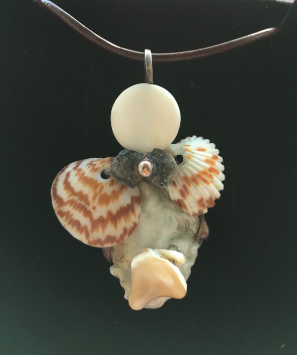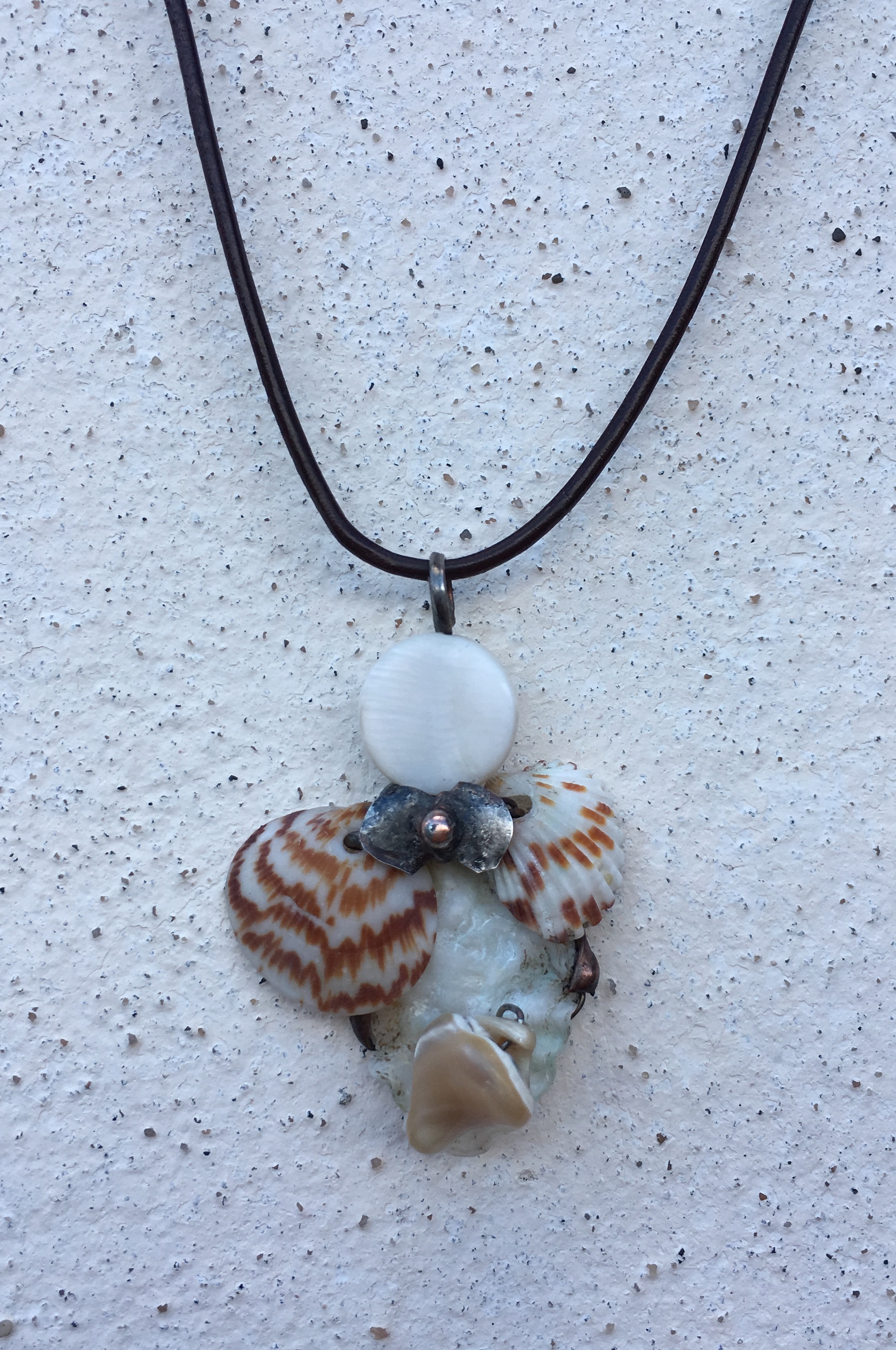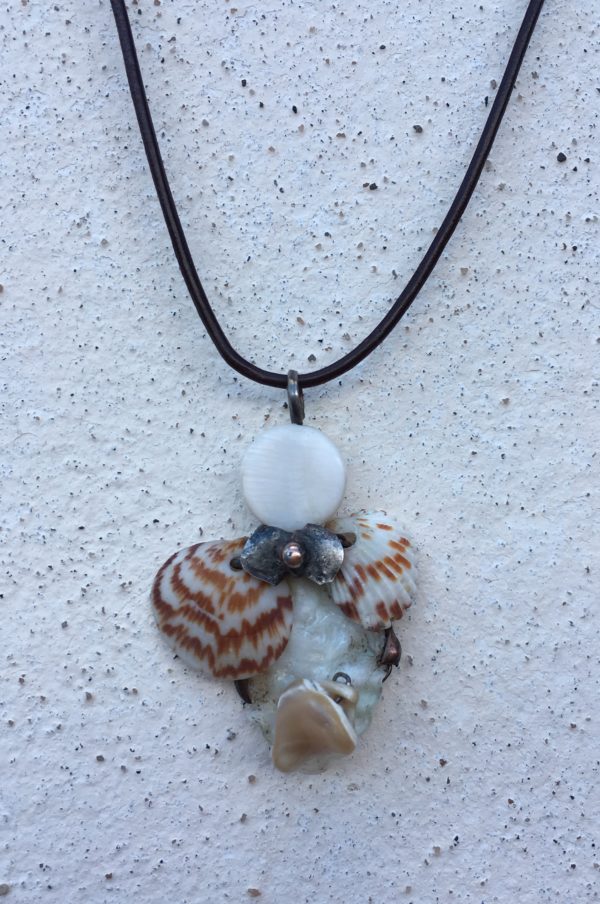 Bezolovnatým cínem s příměsí stříbra pájený autorský šperk doplněný mušlemi a perletí