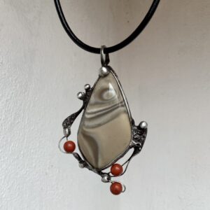 Bezolovnatým cínem s příměsí stříbra pájený autorský šperk doplněný meteoritem a hlavičkou z křišťálu aqua aury.