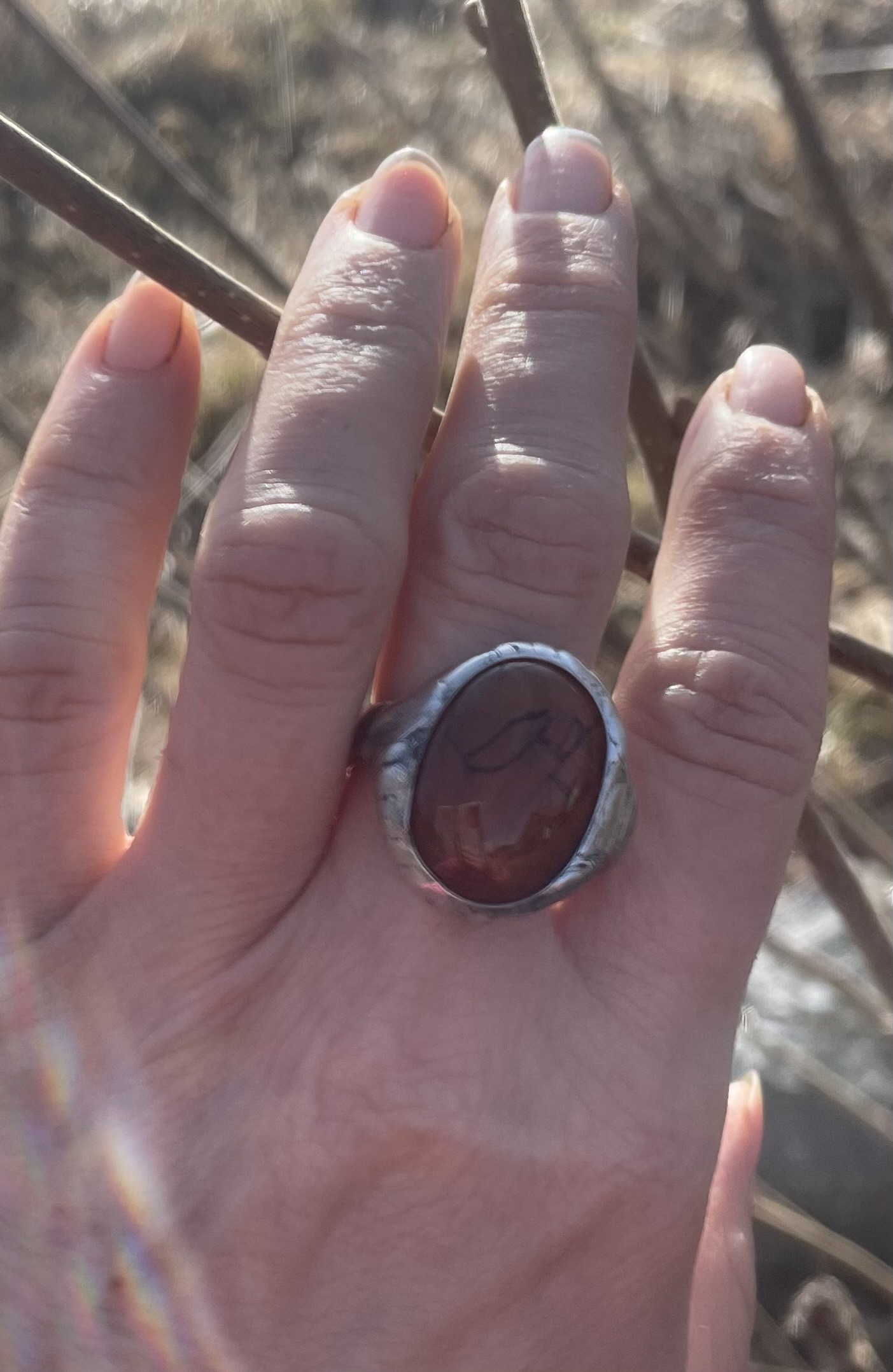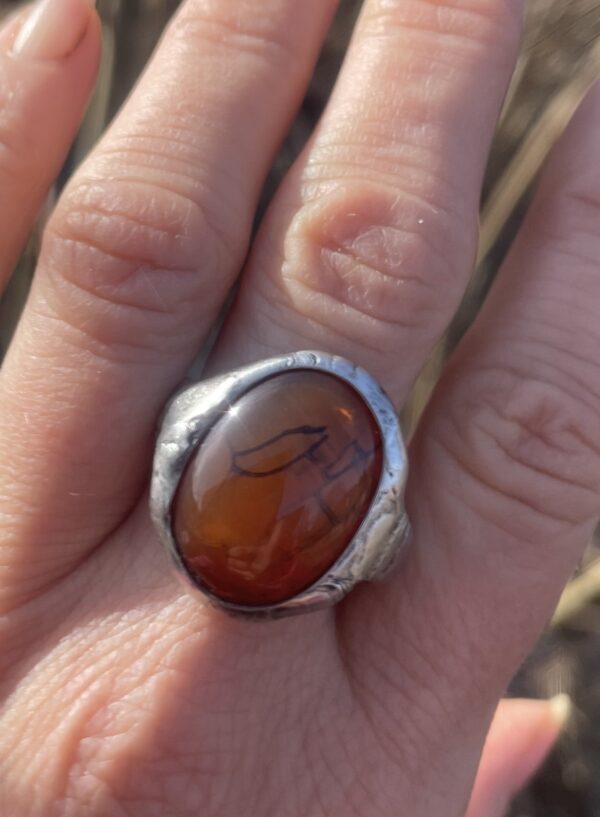 Bezolovnatým cínem s příměsí stříbra pájený autorský prsten  doplněný dračím achátem.