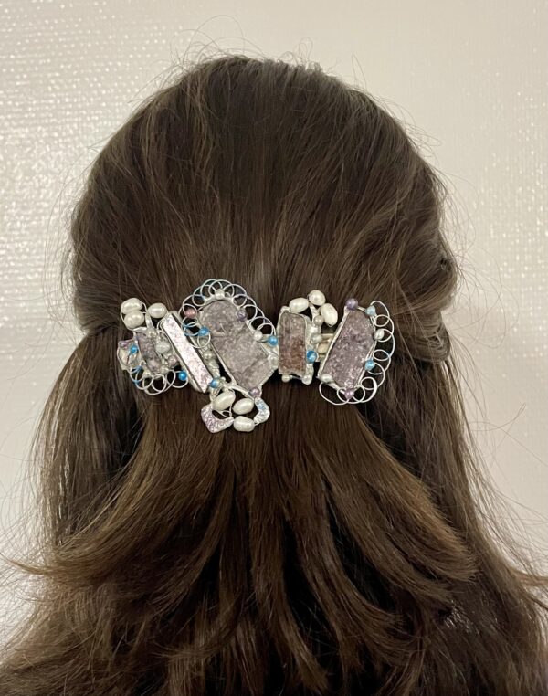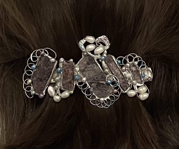 Bezolovnatým cínem s příměsí stříbra autorská spona do vlasů, doplněná lepidolitem a perličkama.