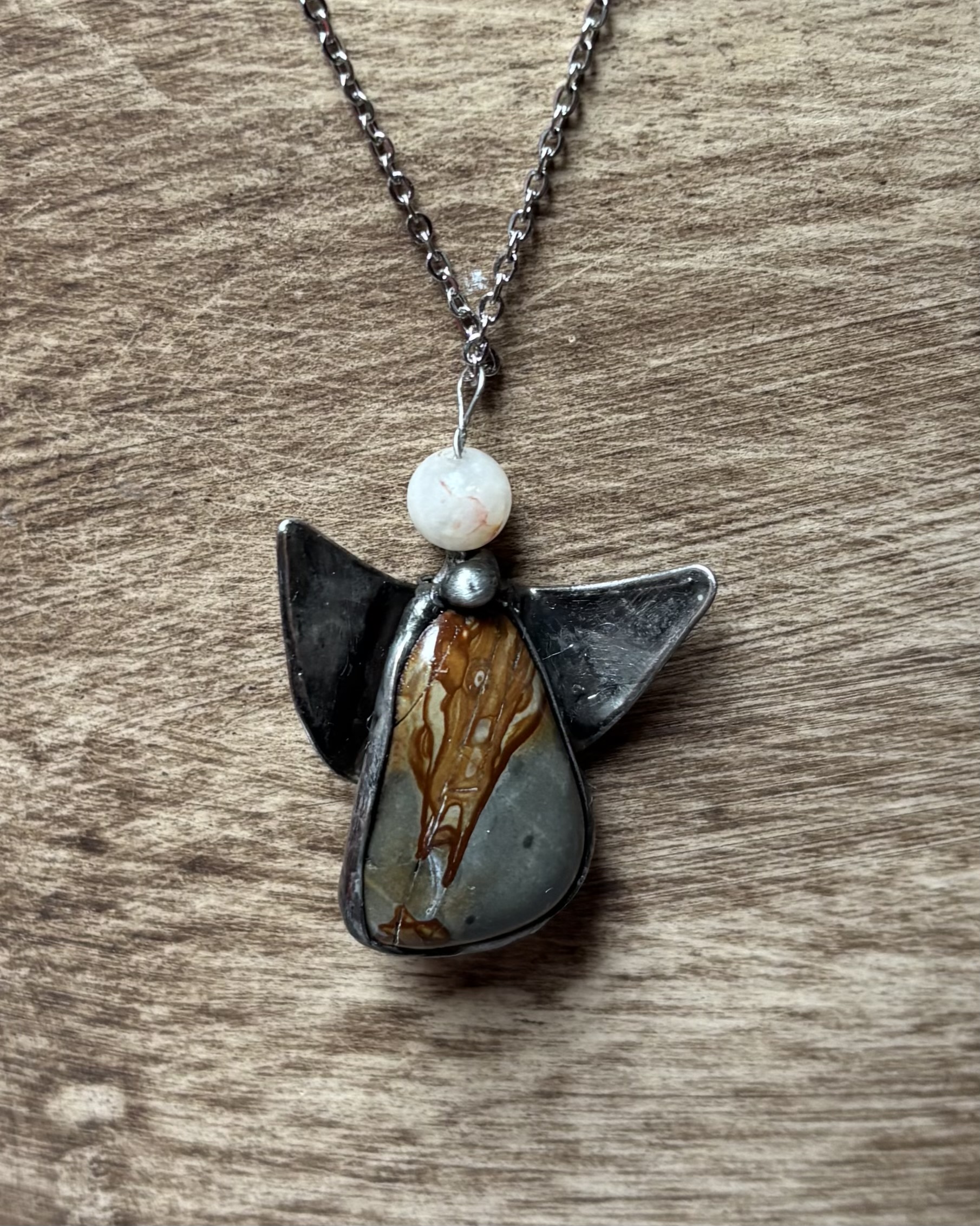 Bezolovnatý cínem s příměsí stříbra pájený autorský šperk, doplněný porcelanitem kuličkou opálu červeného.