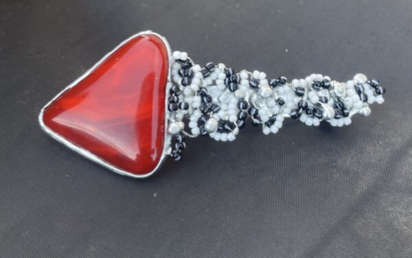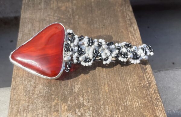 Bezolovnatým cínem s příměsí stříbra  autorská spona, doplněná fusingovým sklem a rocailem.