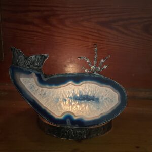 Bezolovnatým cínem s příměsí stříbra pájený autorský svícen, doplněný achátovým plátkem a sklem.