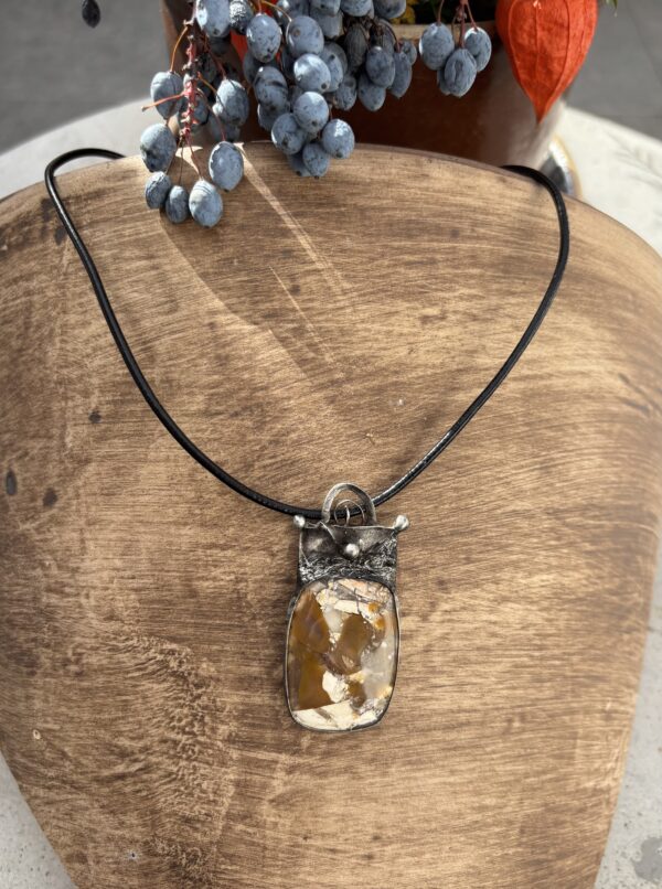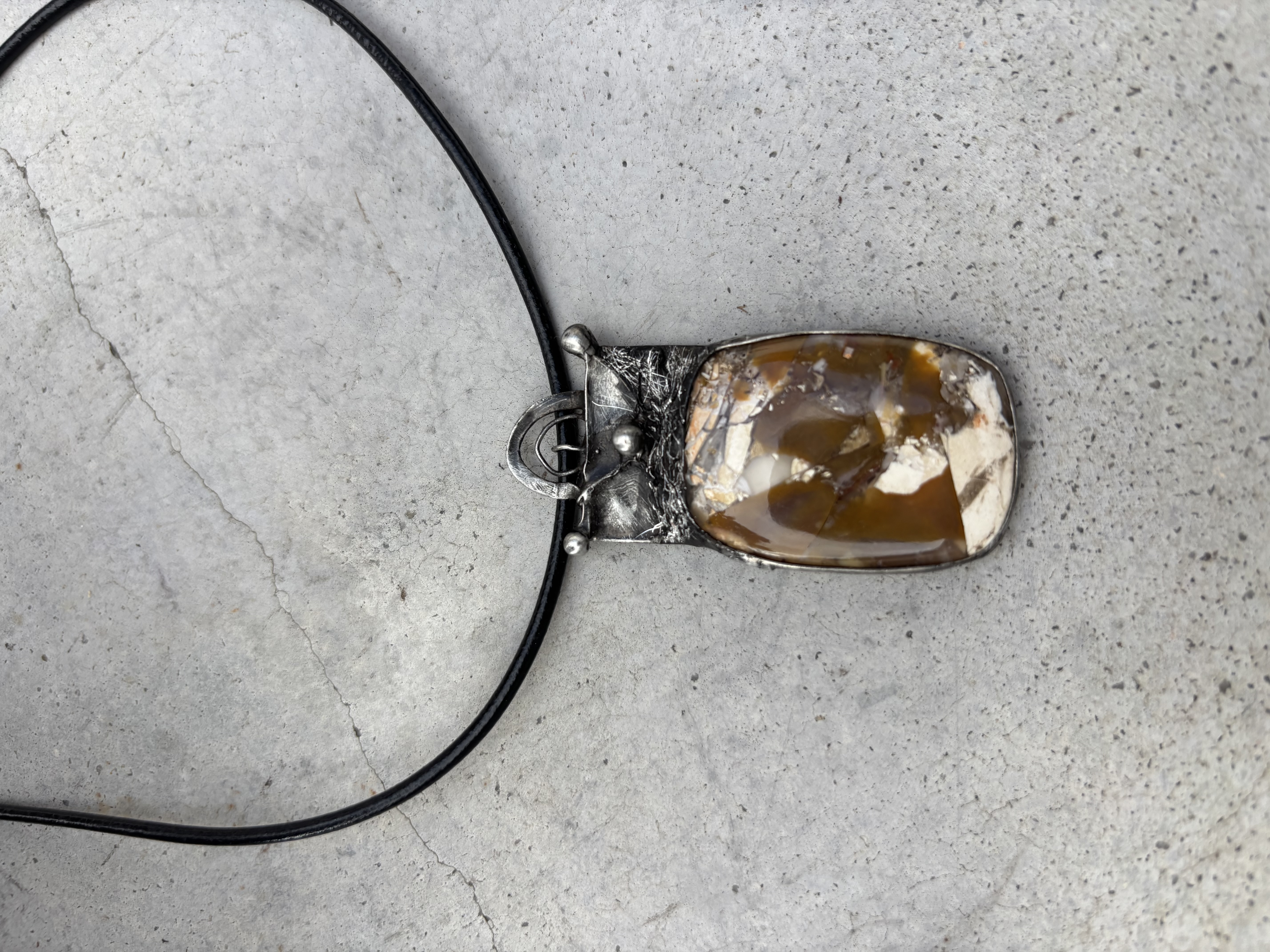 Bezolovnatým cínem s příměsí stříbra pájený autorský šperk , doplněný přírodním brekciovým mokaitem.